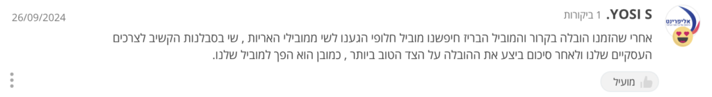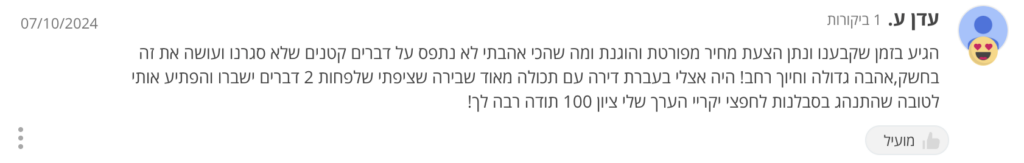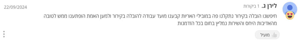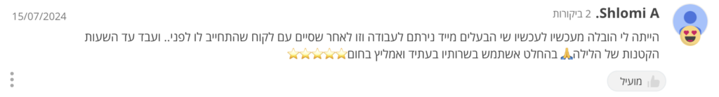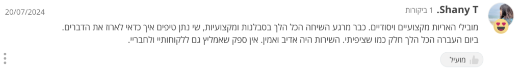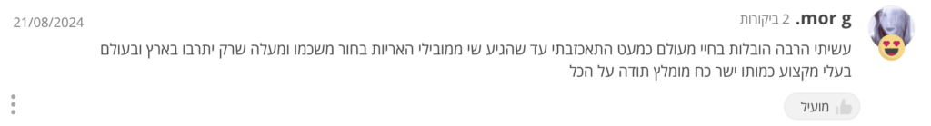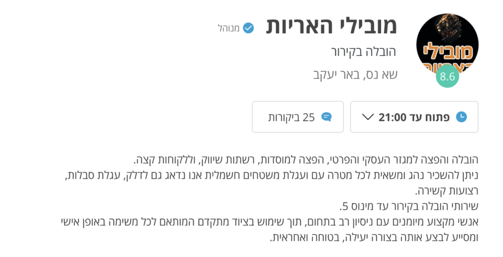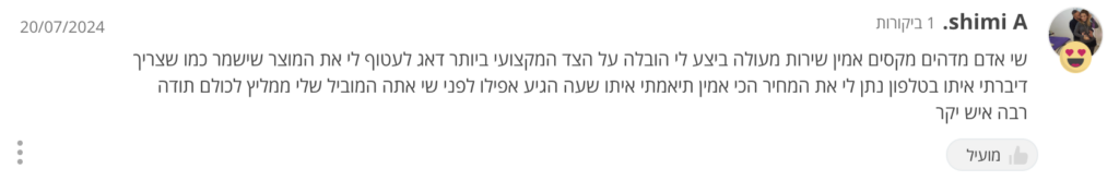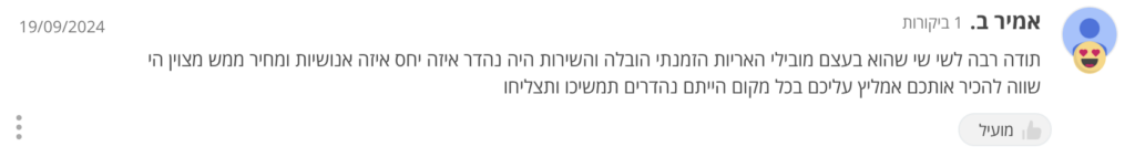 מְעוּלֶה מבוסס על 28 ביקורות פורסם ב- Guy HarpazTrustindex מוודא שהמקור המקורי של הסקירה הוא Google. מובילי האריות היא החברה הכי טובה ואמינה בארץ עובד איתם כבר שנתיים. תמיד גיבו אותי במשימות לוגיסטיות מסובכות ממליץ בחום !! שירות, מקצועיות, אמינות ומחוייבותפורסם ב- מירב פלחTrustindex מוודא שהמקור המקורי של הסקירה הוא Google. חייבת לציין לשבח את הבעלים שי שירות אדיב מהיר ומקצועי אין ספק שבחרנו נכון תעלו ותצליחופורסם ב- אשר ברנסTrustindex מוודא שהמקור המקורי של הסקירה הוא Google. חיפשתי מוביל וראיתי את המשאית של מובילי האריות נותנת שירות בשטח , כתבתי את המספר ודיברתי עם שי קבענו הובלה הכל היה מצויין. חשוב לציין אני קבלן גמר הובלות אצלי הם דבר מאוד רגיש חששתי בהתחלה ובסוף הבנתי שהיה שווה.פורסם ב- עדן כראדיTrustindex מוודא שהמקור המקורי של הסקירה הוא Google. שירות ששווה הכל 💚פורסם ב- דור בריןTrustindex מוודא שהמקור המקורי של הסקירה הוא Google. שירות מקצועי ביותר!!!!פורסם ב- עומרי גרשוןTrustindex מוודא שהמקור המקורי של הסקירה הוא Google. שירות טוב מקצועי ואמין לי נתן שקט ועזרה שהייתי צריך 💪🏼💪🏼 נעזרתי בבחור בהובלות שונות עיסקי - לכמה מקומות בארץ בכמה פעמים וכל פעם פשוט היה לי שקט שגר ושכחפורסם ב- אליהו תורג'מןTrustindex מוודא שהמקור המקורי של הסקירה הוא Google. שירות מספר 1 זו לא פעם ראשונה איתם וכיף לדעת שאפשר לסנוך עלהם בעניים עצומות עושים טת הכל בצורה הכי מקצועית שיש רמה אחת מעל כולםפורסם ב- עומר כרושTrustindex מוודא שהמקור המקורי של הסקירה הוא Google. אלופים שירות מקצועי מחירים נוחים ואנשים ישריםפורסם ב- עליזה בן-חיוןTrustindex מוודא שהמקור המקורי של הסקירה הוא Google. תקשורת מעולה , שירות אדיב , מדויק ואמין